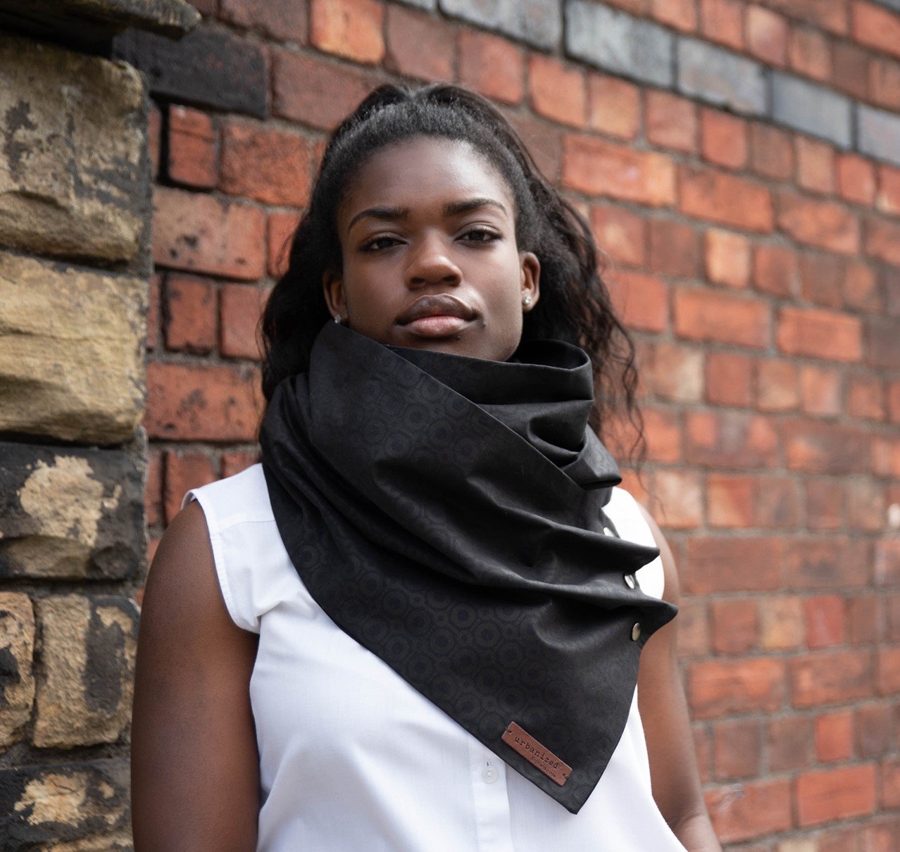 This fully handcrafted unisex asymmetric style neck wrap with side stud fasteners is fashioned from a rich Black geometric patterned African print block wax cotton fabric. An edgy design neckwear in modern African fabric print provides the perfect style contrast for any confident fashionista.