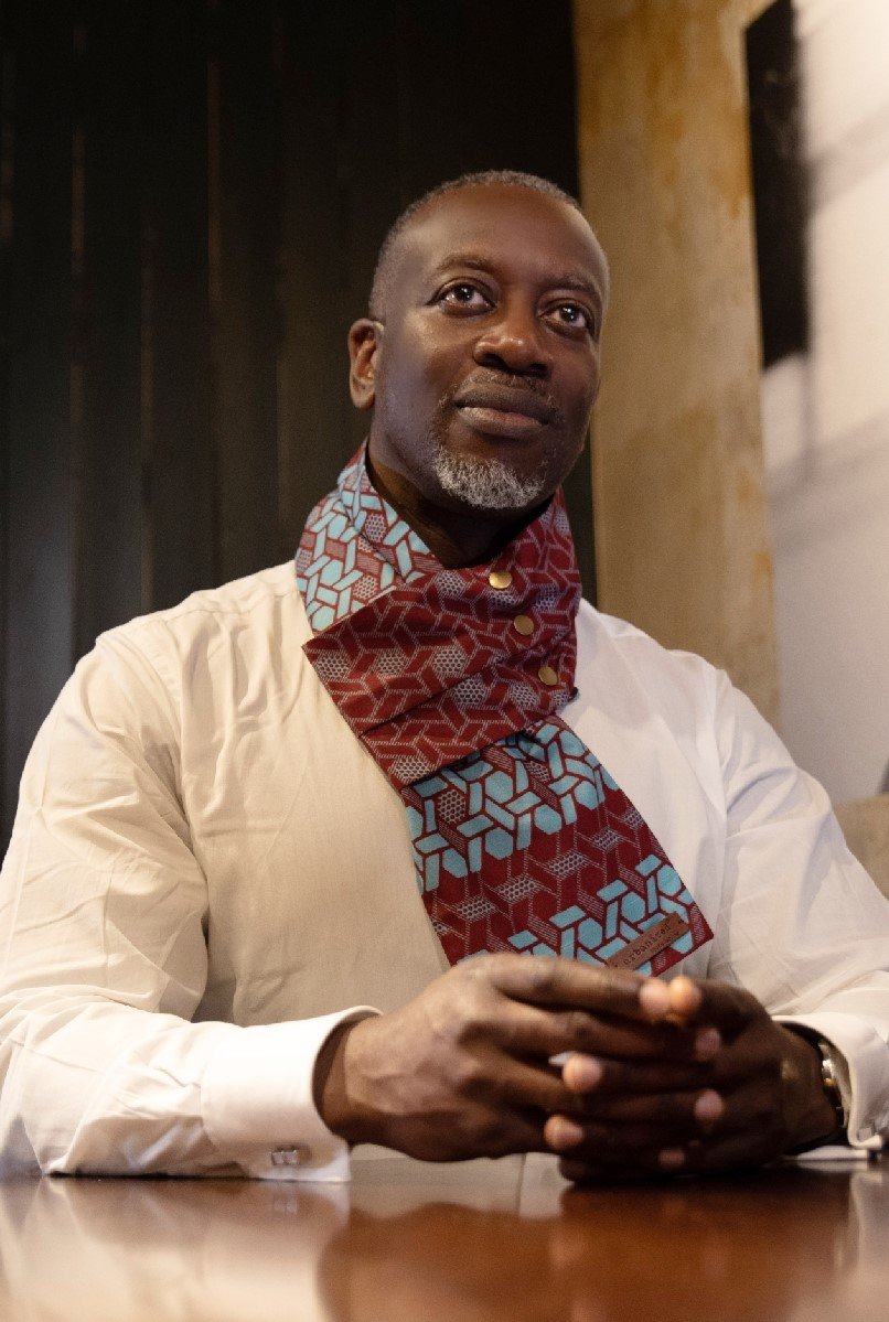 Jahi – Unisex African embossed black waxed fabric cross over neck scarf / neck wrap/ neckwear with brass press stud detail