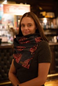 This fully handcrafted ladies infinity style neck wrap with three front brass stud fasteners is fashioned from a vibrant blue and red African print block wax cotton fabric. An edgy design neckwear in traditional African fabric print provides the perfect style contrast for any confident fashionista.