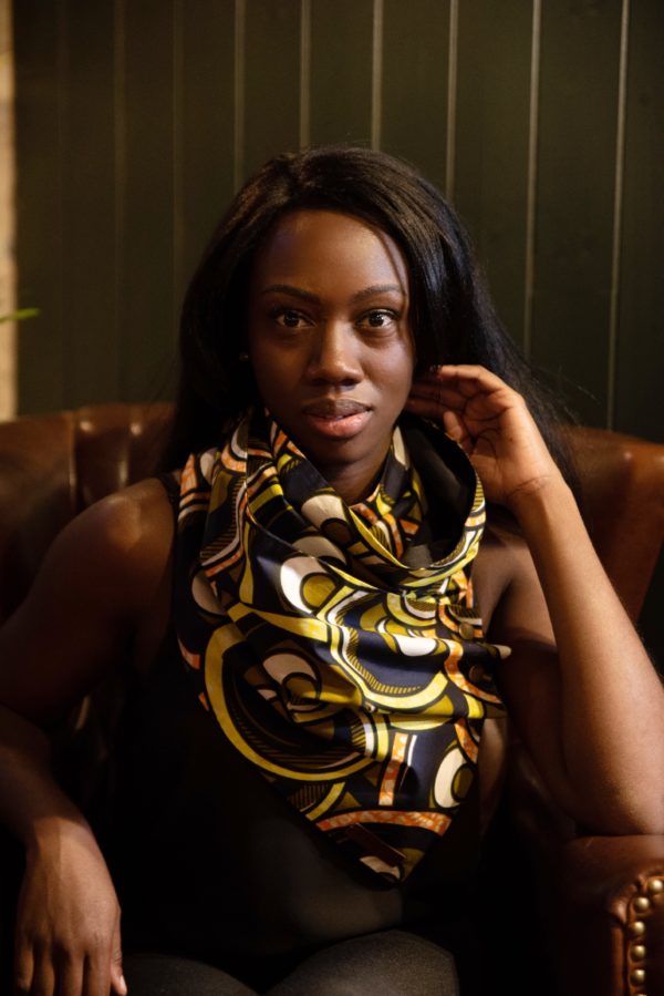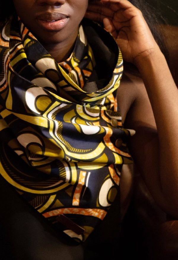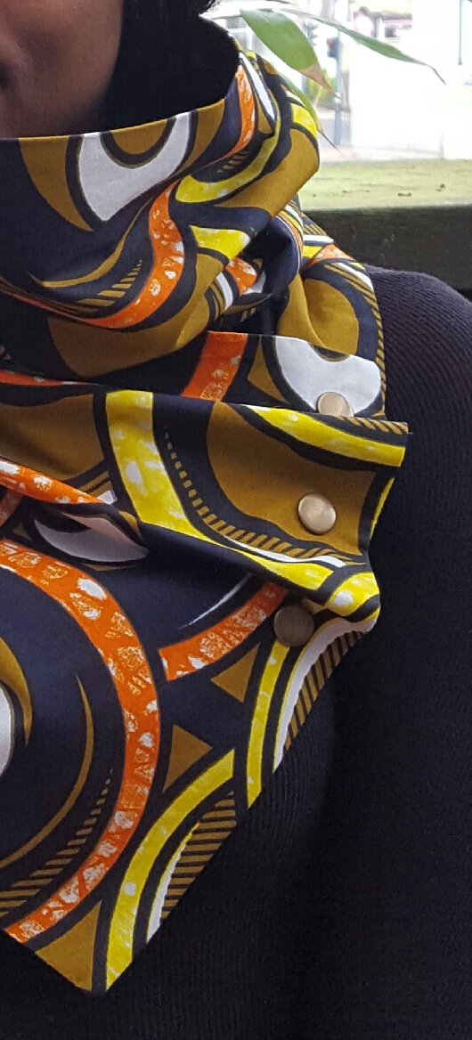 This fully handcrafted ladies infinity style neck wrap with three front brass stud fasteners is fashioned from an eye catching circular design in khaki, yellow, orange, black and white African print block wax cotton fabric. An edgy design neckwear in a modern African fabric print provides the perfect style contrast for any confident fashionista.